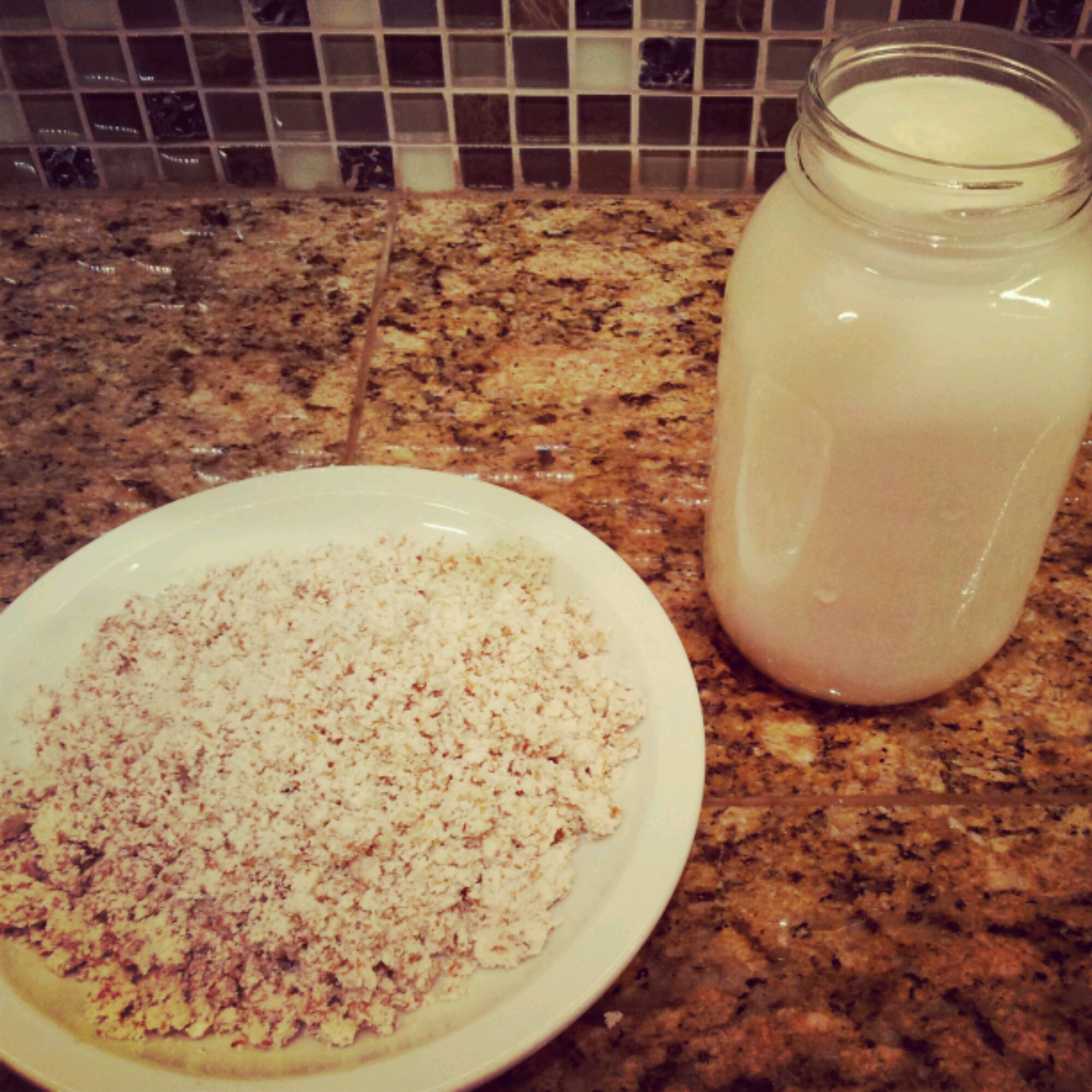 Back to the recipe. We were straining our nut milk (heheh). Periodically gather up the edges of the cheesecloth and squeeze out as much milk from the almond meal as possible. Place the almond meal into a jar or plate, rinse off the cheesecloth, and continue repeating this process until all the milk has been separated from the meal.